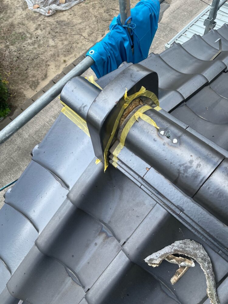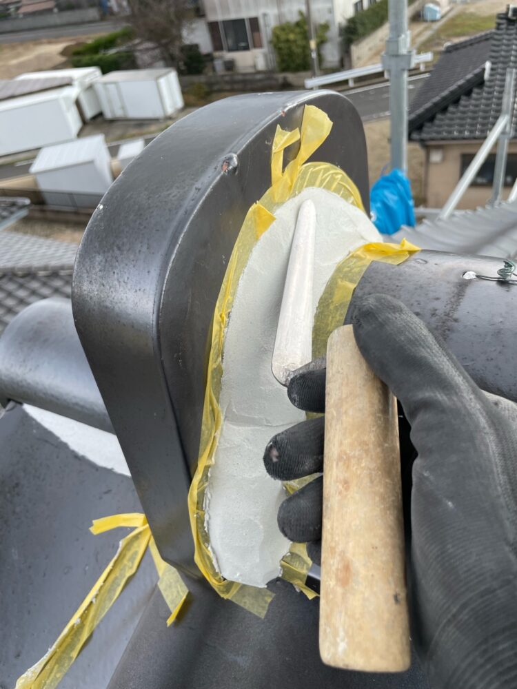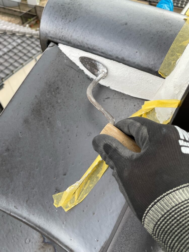 写真にも写っているように、修繕しているのは棟の端部分(鬼瓦)と、そこにつながる巴瓦の接合部分(白い部分)です。