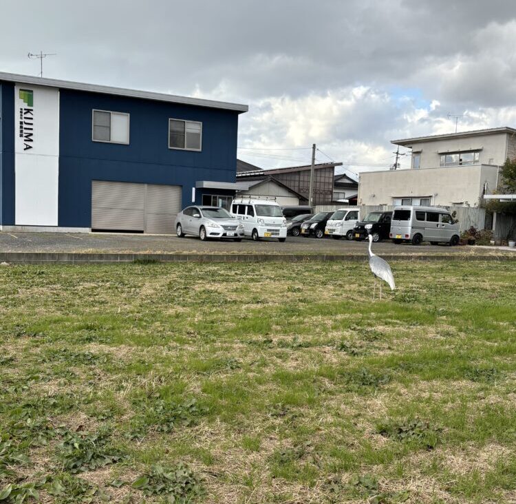 なんと、ツルが本社前の空き地をゆっくり歩いていました。