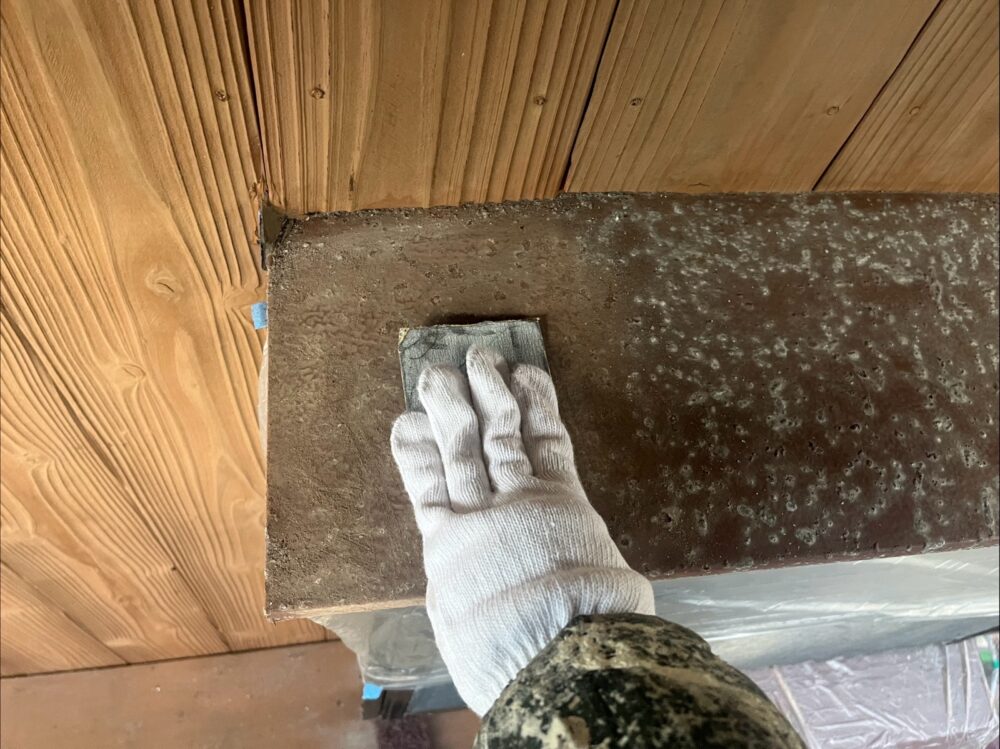 写真は、サンドペーパーで古い塗膜や汚れを落とす ケレン(研磨)作業 の様子です。