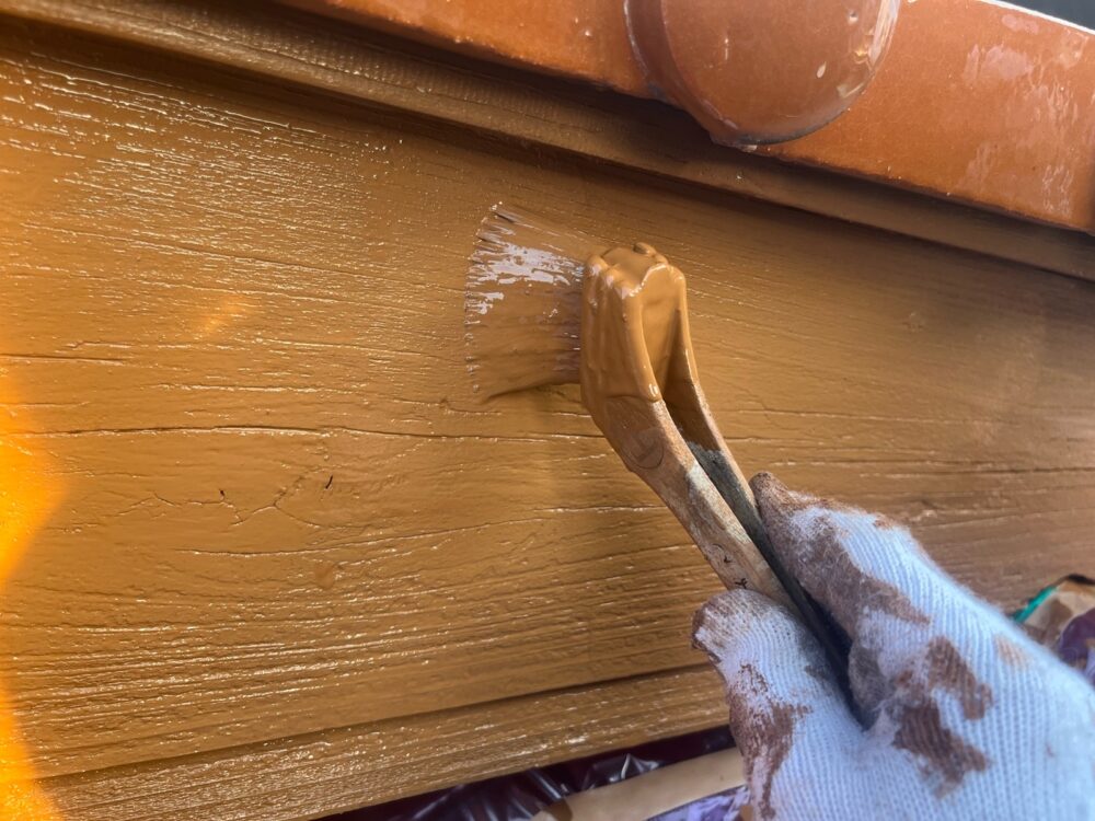 黄土色(オレンジ系)の塗料を刷毛で塗っている写真は 上塗り(仕上げ) の作業です。