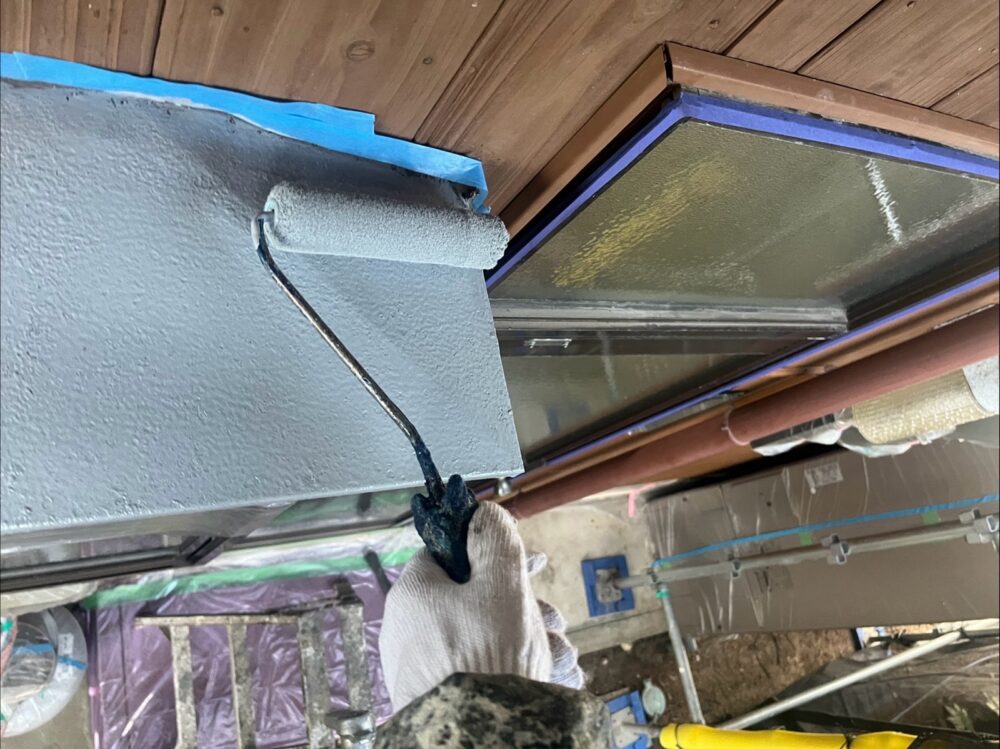 灰色の塗料を塗っている写真は、鉄部に使用する サビ止め(下塗り) の工程です。