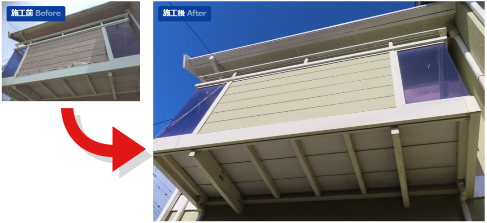 築31年が経過し、劣化が進行していたベランダの壁のサイディングは、塗装するだけではなく新しいサイデイングボードへ交換をし塗装を行いました。