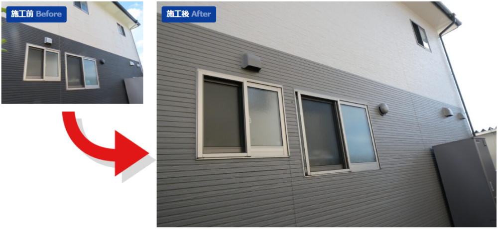 一部サイデイングは新しいものと交換させていただき、外壁の角(コーナー部分)に割れが発生し発生していたため板金を取り付け強度と水漏れの不安を根本から解消しました。