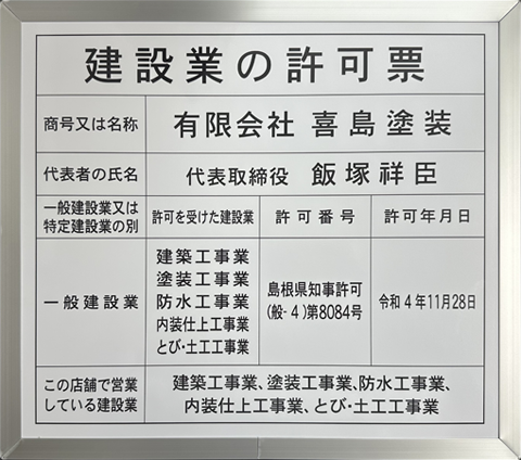 | 許可・加盟など | 島根県知事 第8084号 一般社団法人 日本塗装工業会 |