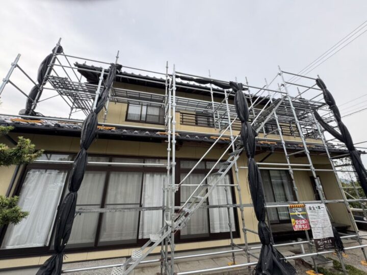 職人の安全と施工の質を高めるために足場を設置し、飛散防止のメッシュシートをかけます。