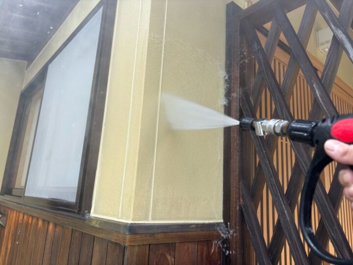 高圧洗浄機を使って表面に付着している旧塗膜や汚れ・苔・カビなどを除去します。不純物を取り除き、塗装面と塗料の密着度を向上させるための重要な作業です。