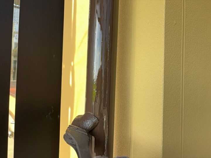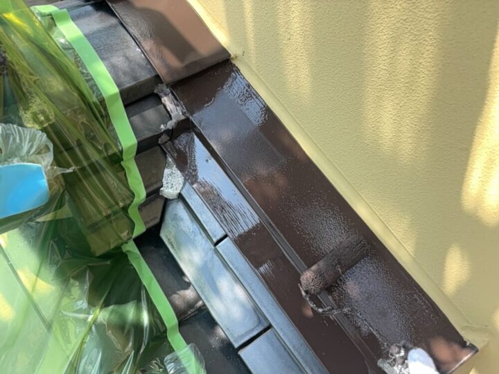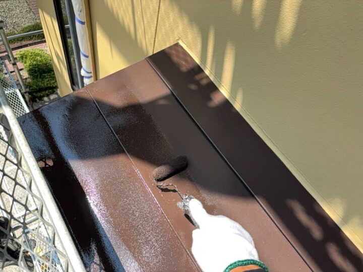 金属製の屋根水切り。ケレン→下塗(錆止め)→外壁色で2回塗りで仕上げました。
