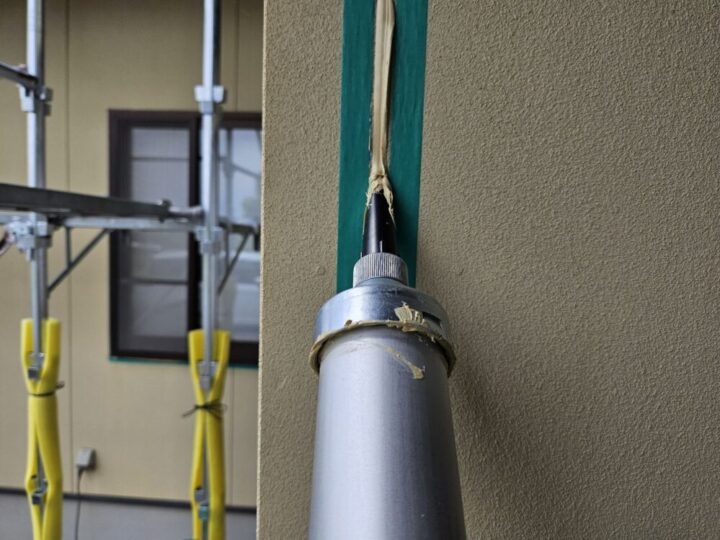 樹脂製の竪樋。ケレン→高耐候シリコン塗料2回塗りで仕上げます。