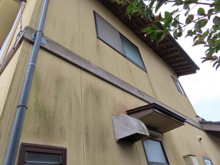 経年劣化で外壁の色褪せやコケ・カビも見られメンテナンスさせていただきました。