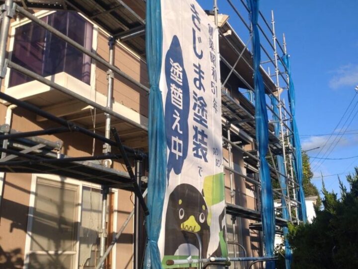 職人の安全を守り、質の高い工事を実現するため足場を組み、飛散防止用のメッシュシートをかけます。