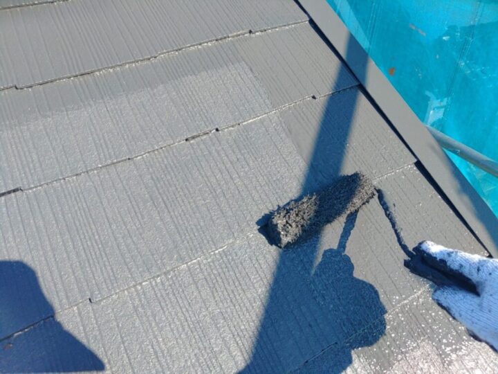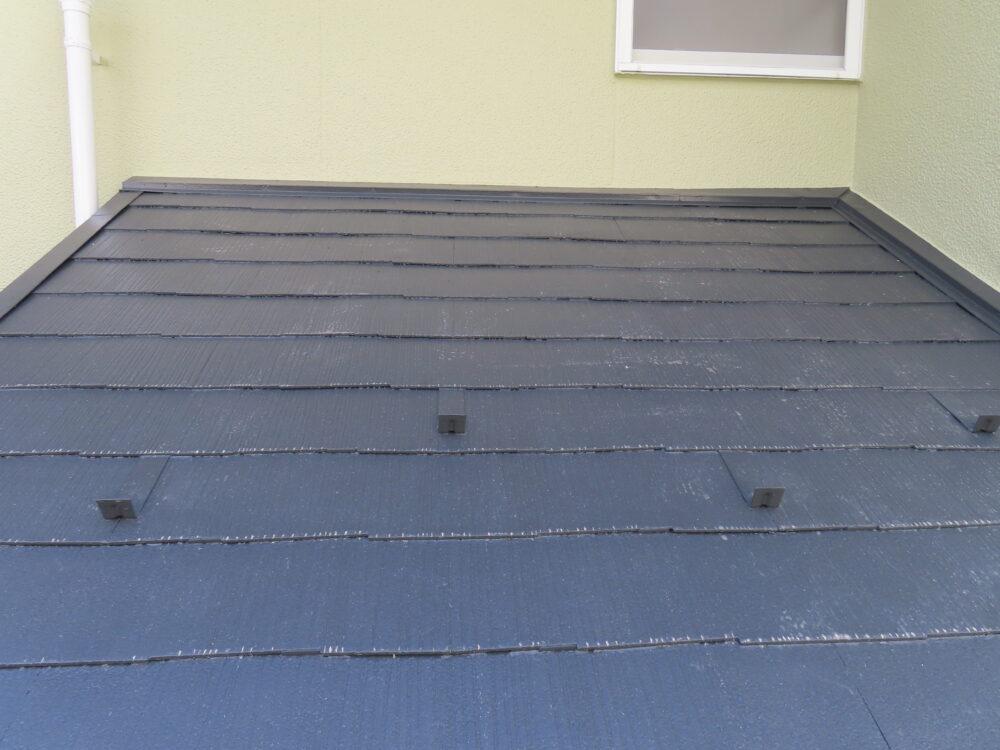 下塗り乾燥後、アクリル系樹脂塗料2回塗りで仕上げます。厚膜を形成することで長期に渡って減耗に耐え、屋根材を保護します。