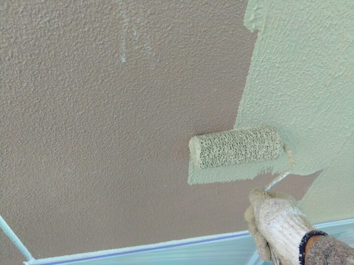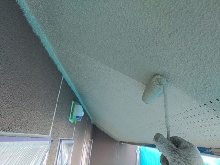 ケイカルの軒天。元々塗装してあったため、下塗(シーラー)→特殊アクリル樹脂塗料2回塗りで仕上げます。