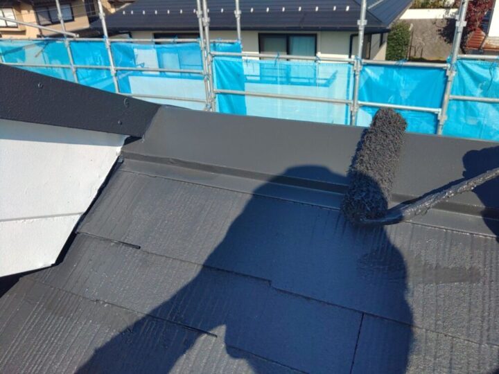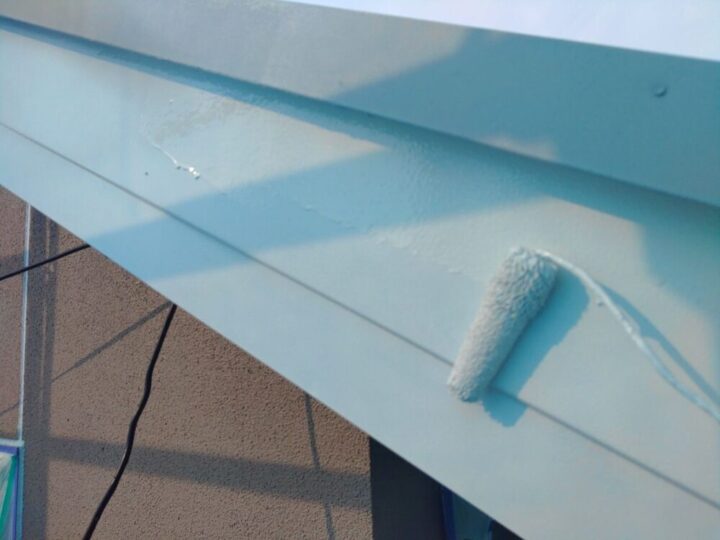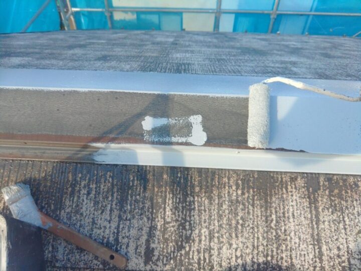 屋根板金も屋根材と同じ色で塗り込んでいきます。